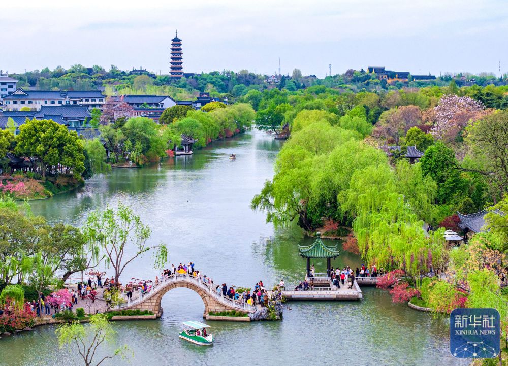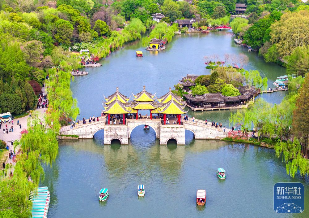 ↑ 4月7日,游客在江苏省扬州市瘦西湖风景区游览(无人机照片)。新华社发(任飞摄)