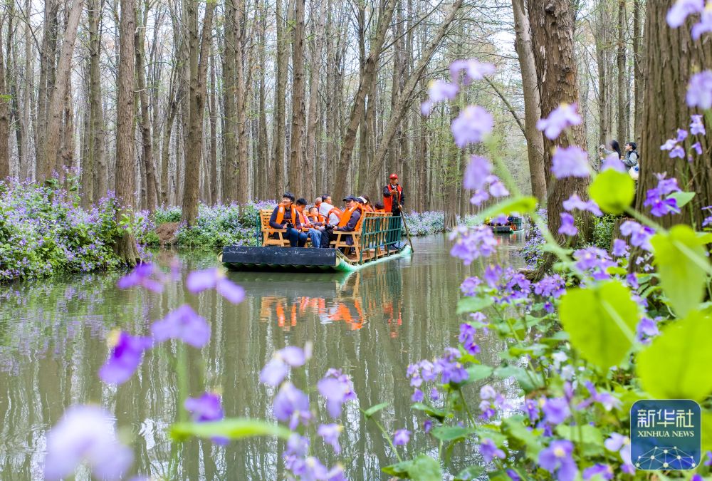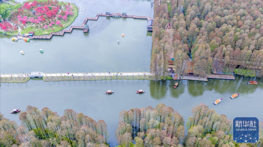 ↑ 4月6日,游客在江苏兴化里下河国家湿地公园赏景游玩(无人机照片)。新华社发(周社根摄)