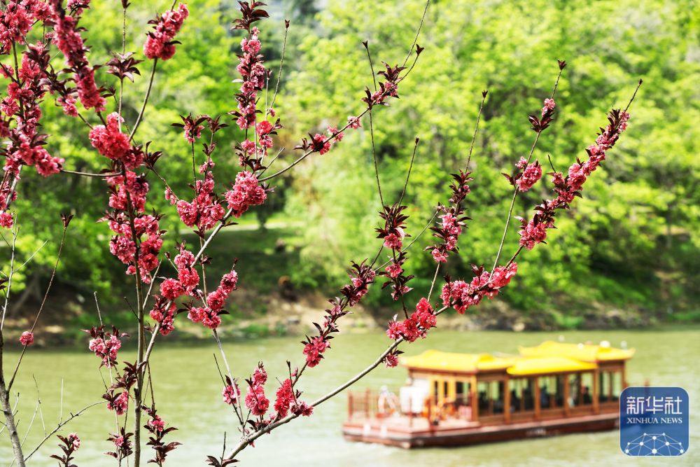 ↑ 4月8日,游客乘坐画舫在江苏南京外秦淮河上赏景游玩。新华社发(孙忠南摄)