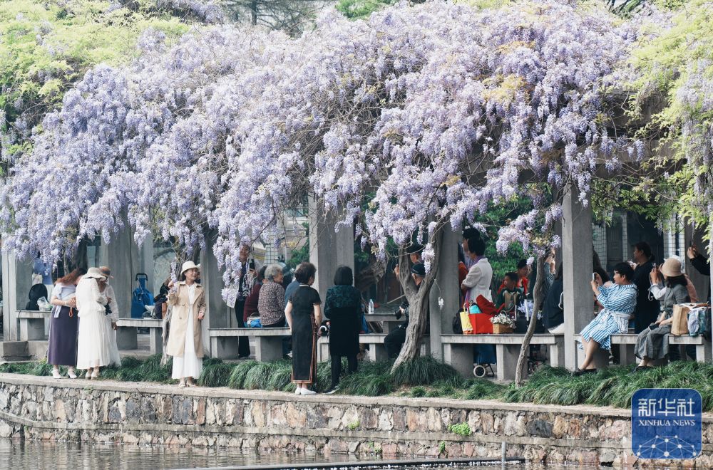 ↑ 4月8日,人们在浙江大学华家池校区观赏盛开的紫藤花。新华社发(龙巍摄)