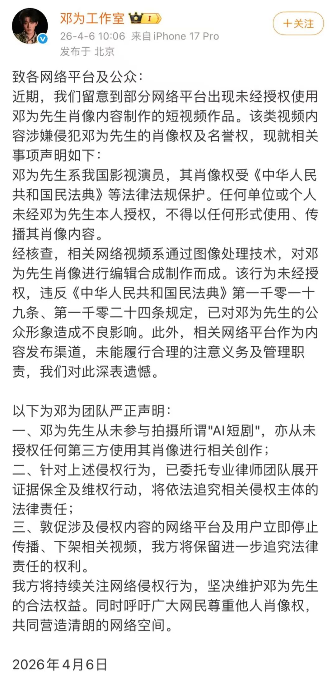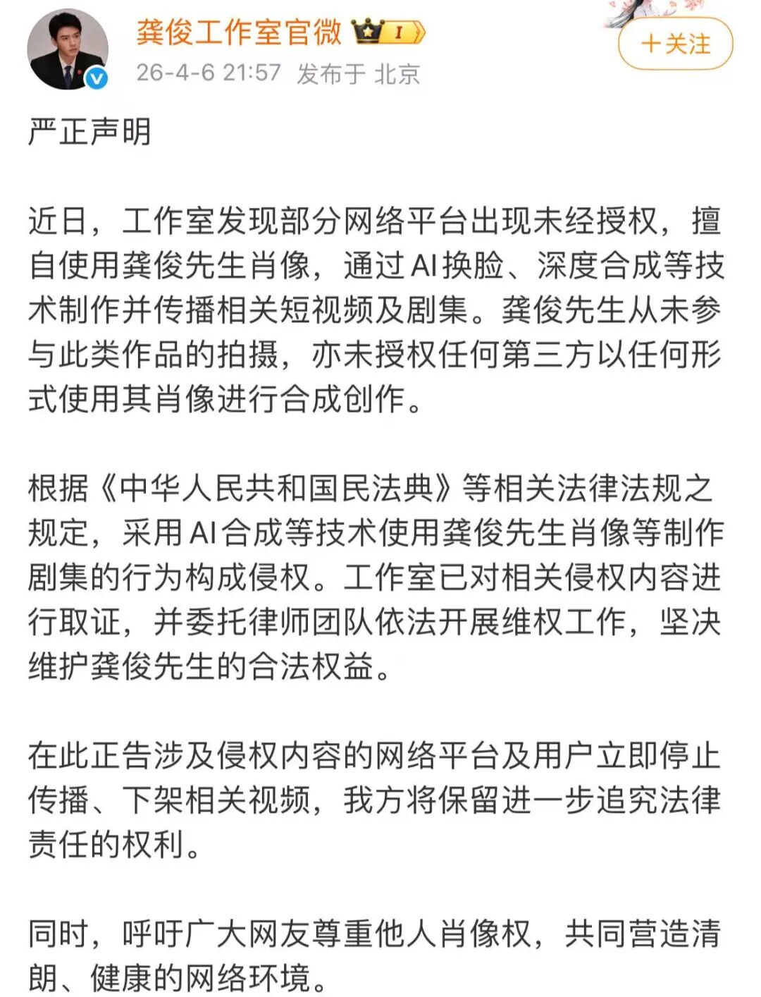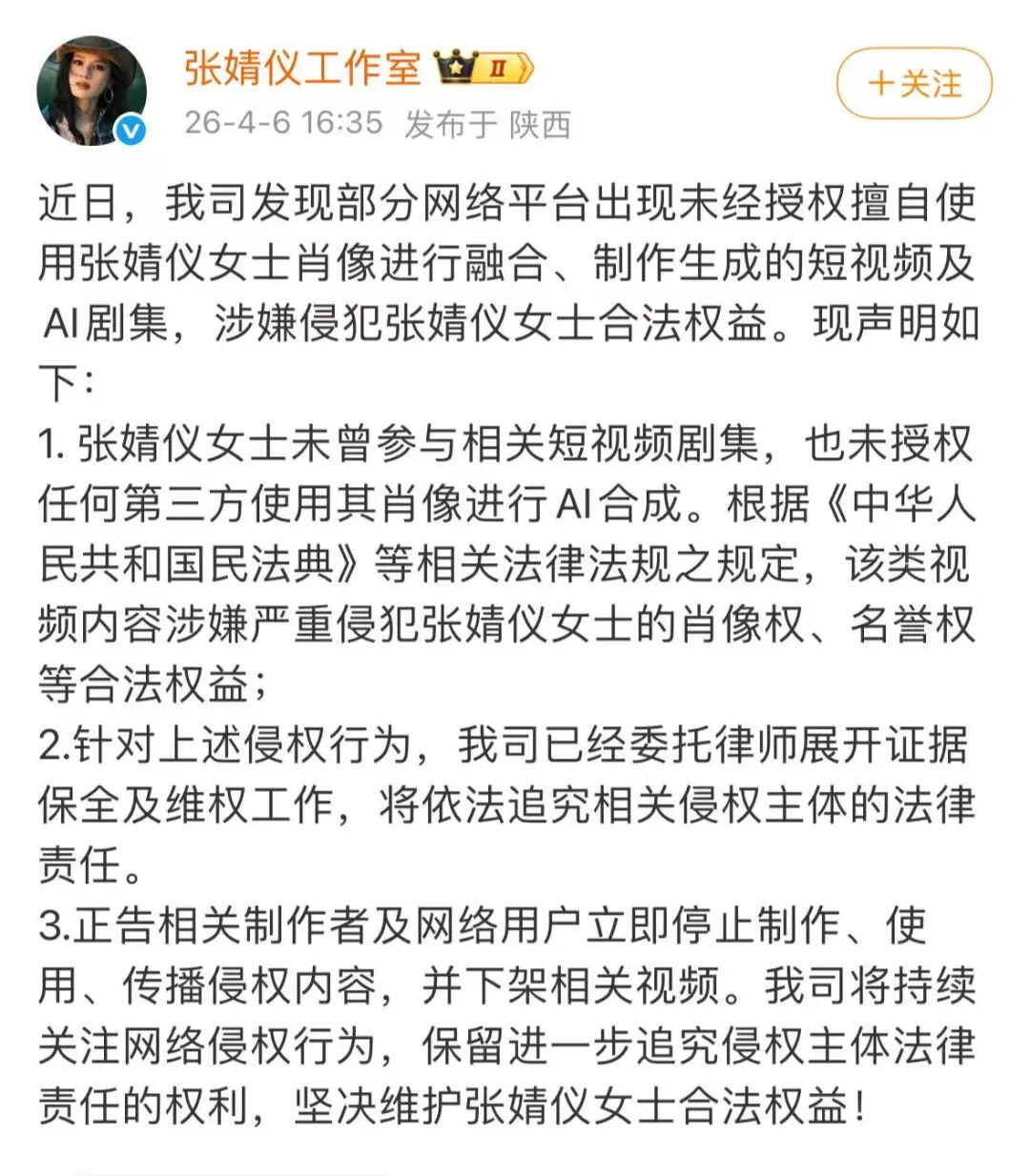 4月6日,张婧仪、龚俊、邓为工作室接连发布抵制AI短剧侵权声明,称部分网络平台未经授权擅自使用其肖像,制作和传播AI剧集,要求停止侵权并下架相关视频。
