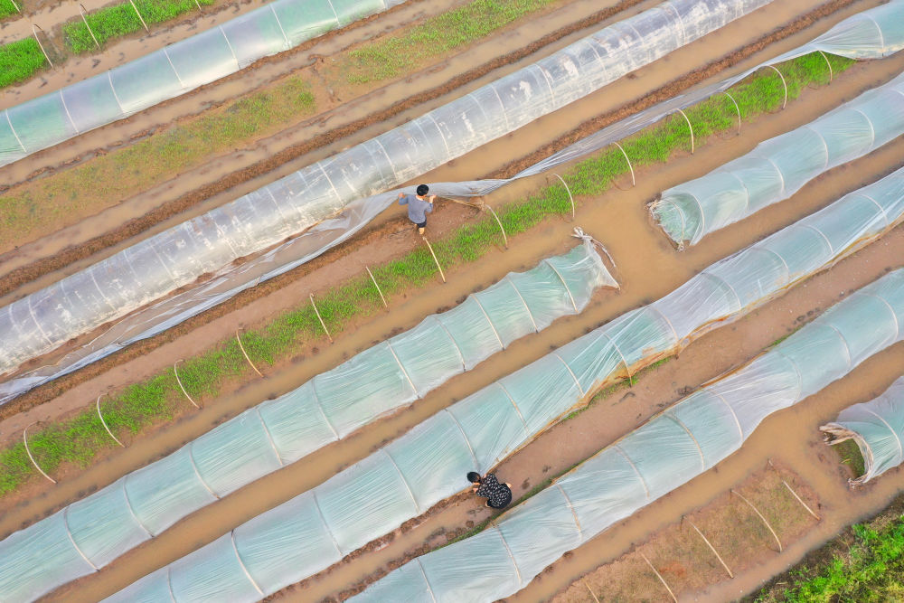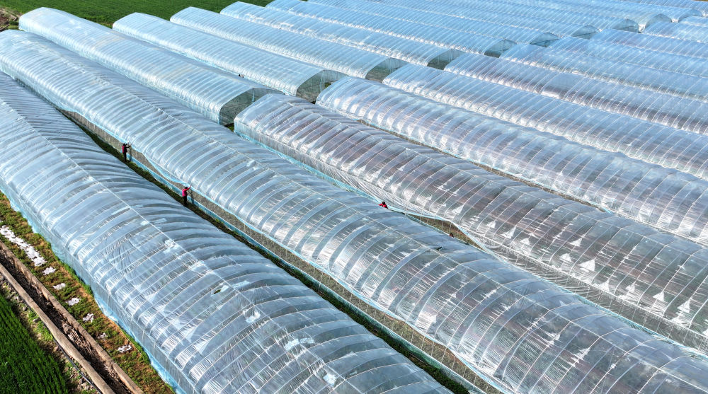 ↑ 4月9日,在河南省洛阳市汝阳县三屯镇北保村,村民给红薯育苗基地大棚通风(无人机照片)。新华社发(康红军摄)
