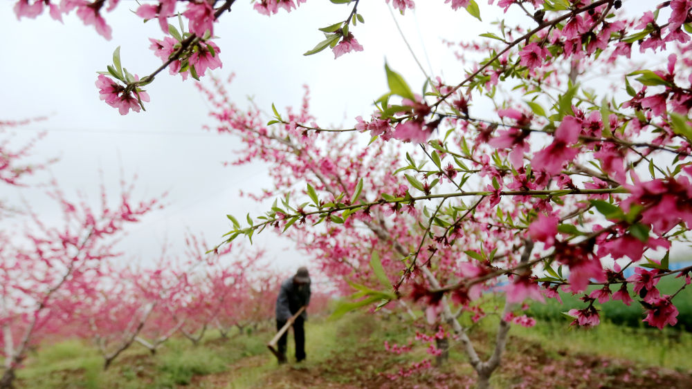 ↑ 4月9日,山东省临沂市平邑县武台镇农民在桃园里劳作。新华社发(武纪全摄)