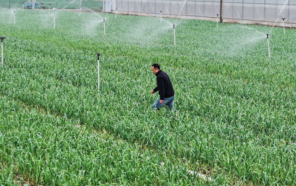 ↑ 4月9日,在山东省邹平市黛溪街道,农民给大蒜浇水(无人机照片)。新华社发(董乃德摄)