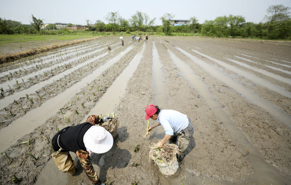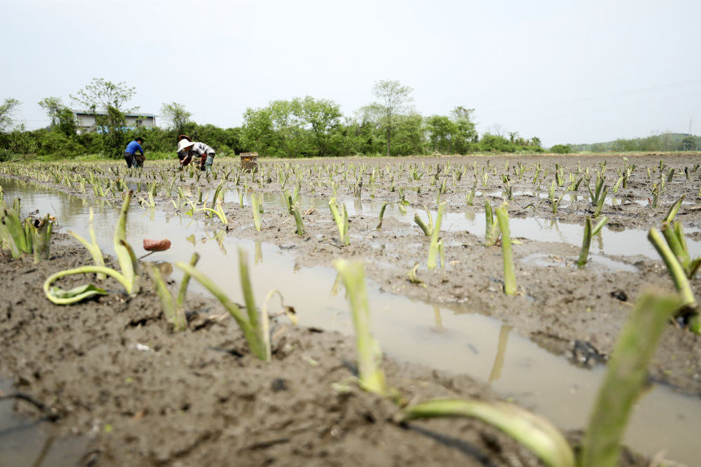 ↑ 4月9日,在湖南省资兴市唐洞街道香花村香芋种植基地,农户在种植香芋。新华社发(李科摄)
