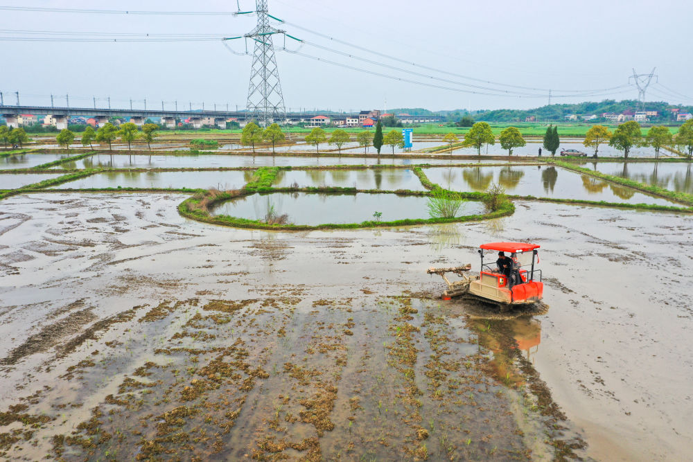 ↑ 4月8日,在湖南省永州市道县梅花镇车头村,村民驾驶插秧机插早稻(无人机照片)。新华社发(何红福摄)
