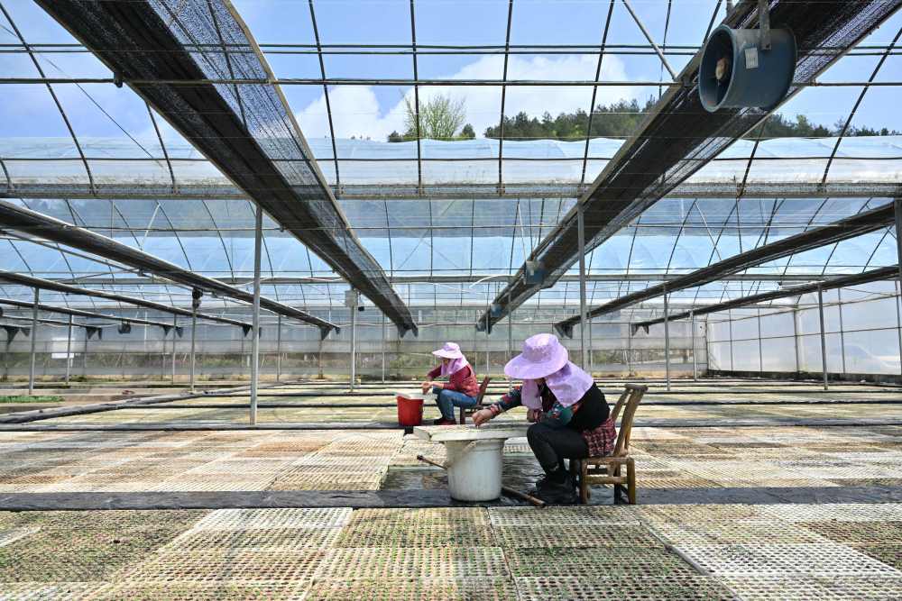 ↑ 4月9日,在湖北省宣恩县椒园镇锣圈岩社区的水上漂浮育苗大棚里,农民进行间苗作业。新华社发(宋文摄)