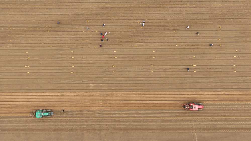 ↑ 4月9日,在山东省聊城市茌平区贾寨镇,农民种植山药(无人机照片)。新华社发(赵玉国摄)