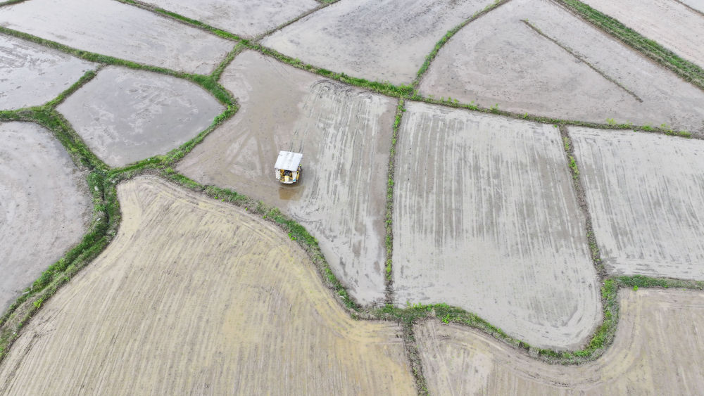 ↑ 4月9日,湖南省衡阳市衡阳县台源镇台九村农民驾驶农机在翻耕农田(无人机照片)。新华社发(刘欣荣摄)