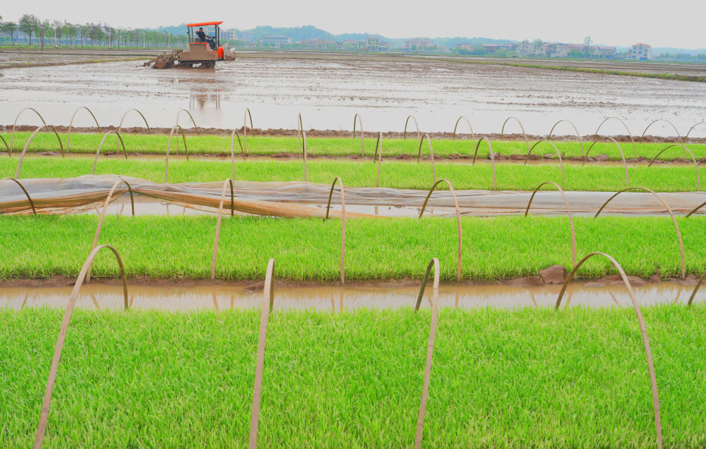 ↑ 4月9日,在湖南省衡阳市衡阳县西渡镇梅花村,农民在管护秧苗(无人机照片)。新华社发(刘欣荣摄)