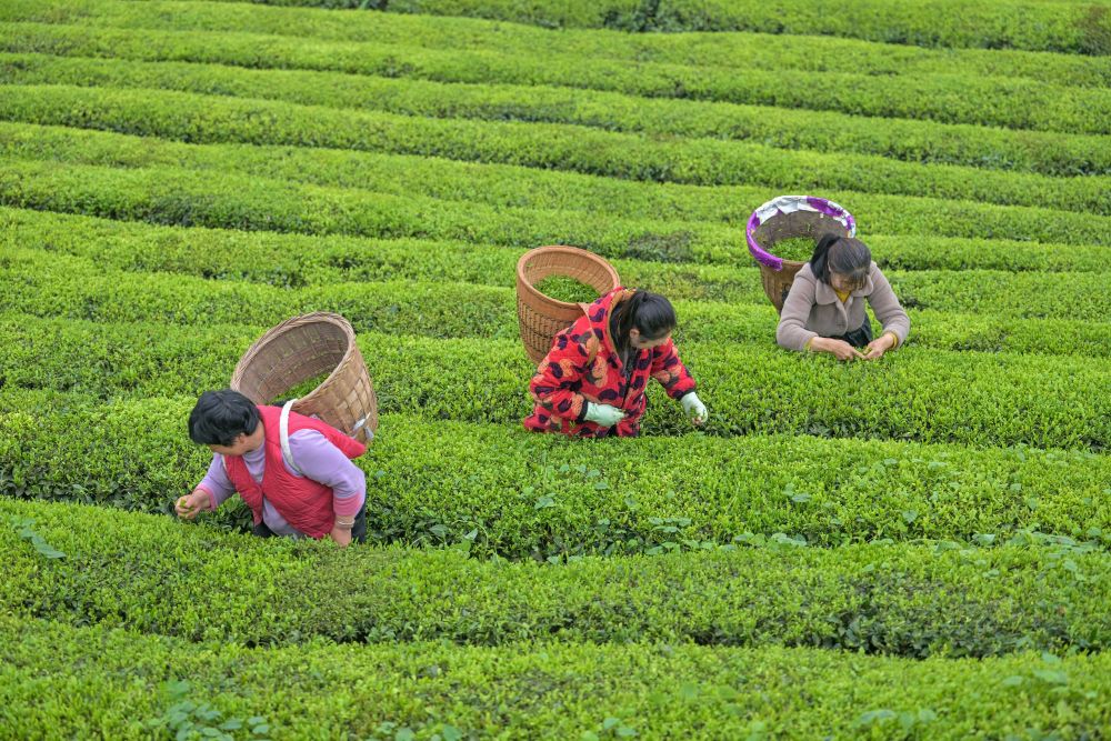 ↑ 4月9日,湖北省宣恩县万寨乡伍家台村茶农将采摘的茶叶放入竹背篓。新华社发(陈绪开摄)