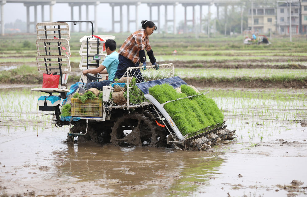 ↑ 4月8日,在湖南省永州市道县梅花镇车头村,村民驾驶插秧机插早稻。新华社发(何红福摄)