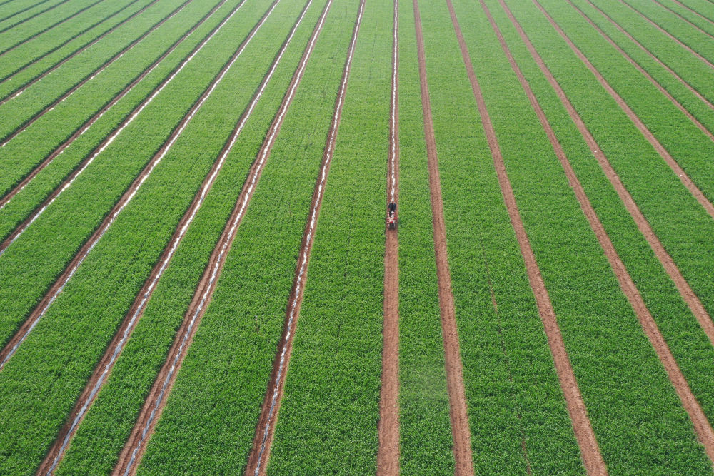 ↑ 4月9日,在河南省商丘市睢县尚屯镇凡庄村一处农田,农机手驾驶播种机种植花生(无人机照片)。新华社发(徐泽源摄)