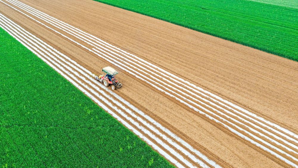 ↑ 4月7日,在河南省沁阳市王曲乡西王曲村,农民使用农机在田间覆盖地膜(无人机照片)。新华社发(杨帆摄)