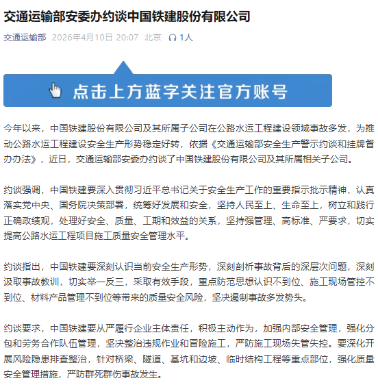 今年以来,中国铁建股份有限公司及其所属子公司在公路水运工程建设领域事故多发,为推动公路水运工程建设安全生产形势稳定好转,依据《交通运输部安全生产警示约谈和挂牌督办办法》,近日,交通运输部安委办约谈了中国铁建股份有限公司及其所属相关子公司。