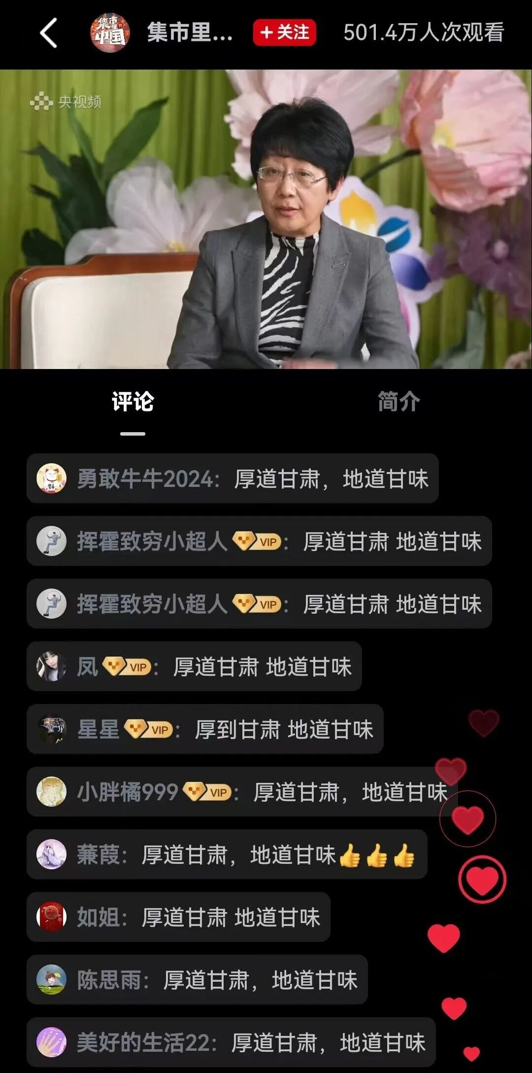 活动期间,节目组邀请甘肃省农业农村厅党组成员、副厅长程江芬做客直播间,围绕“甘味”品牌展开深度对谈,系统回顾“甘味”品牌从无到有、成长为全国知名农业品牌的坚实历程,阐释其品质底气、产业支撑及助农惠农的效益。访谈中,主办方还为央视频观众送上“甘味”好物大礼包,将直播气氛推向高潮,本场央视频直播总观看量超500万人次。