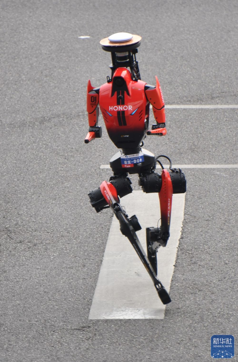↑ 齐天大圣队自主人形机器人选手闪电在比赛中冲线。新华社记者 张晨霖 摄
