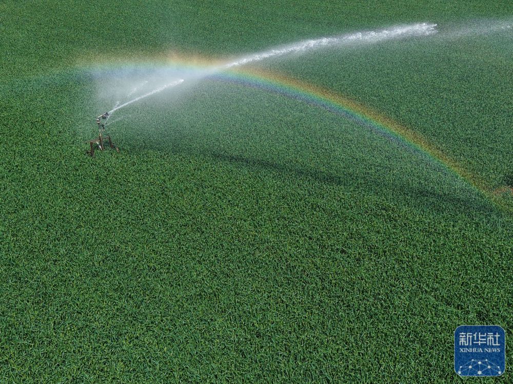 ↑ 4月18日,农田喷灌设备在河南省焦作市温县黄庄镇麦田间进行喷灌作业(无人机照片)。新华社发(徐宏星摄)
