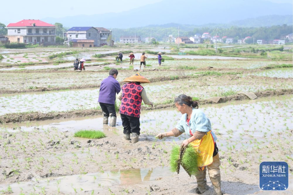 ↑ 4月17日,在湖南省娄底市双峰县井字镇花山村,农民在田间抛秧。新华社发(李建新摄)