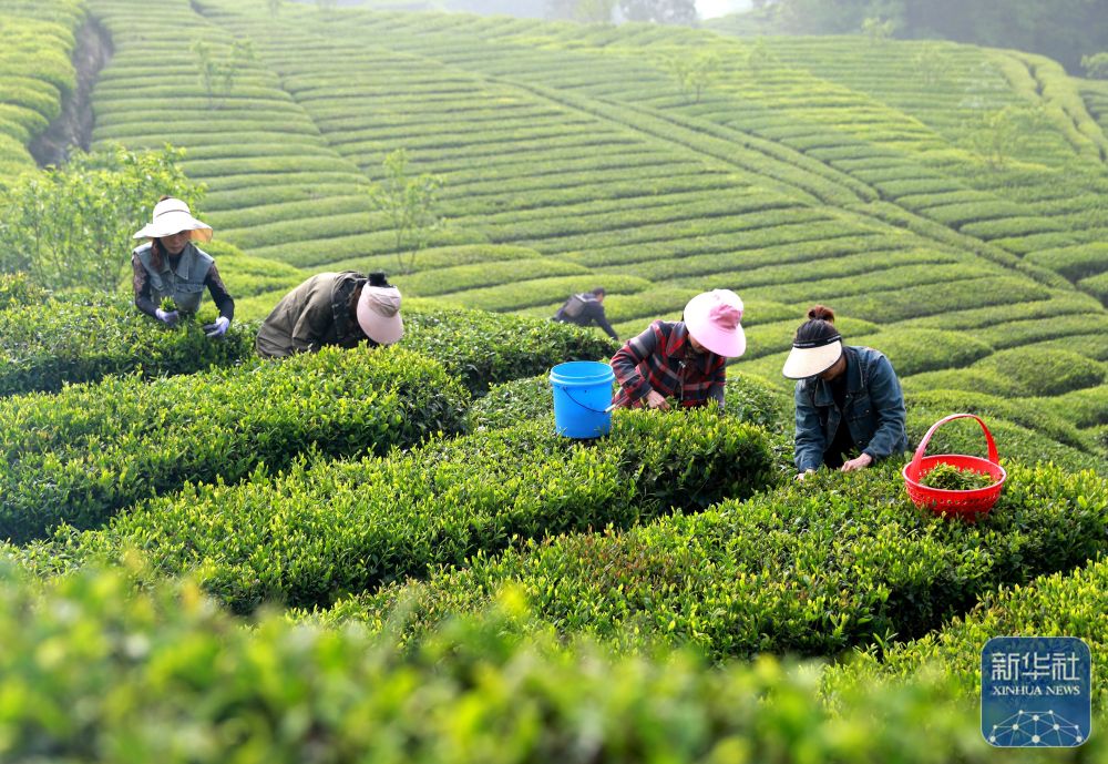 ↑ 4月17日,湖北省秭归县茅坪镇长岭村茶农在一生态茶园采摘雨前茶。新华社发(王罡摄)