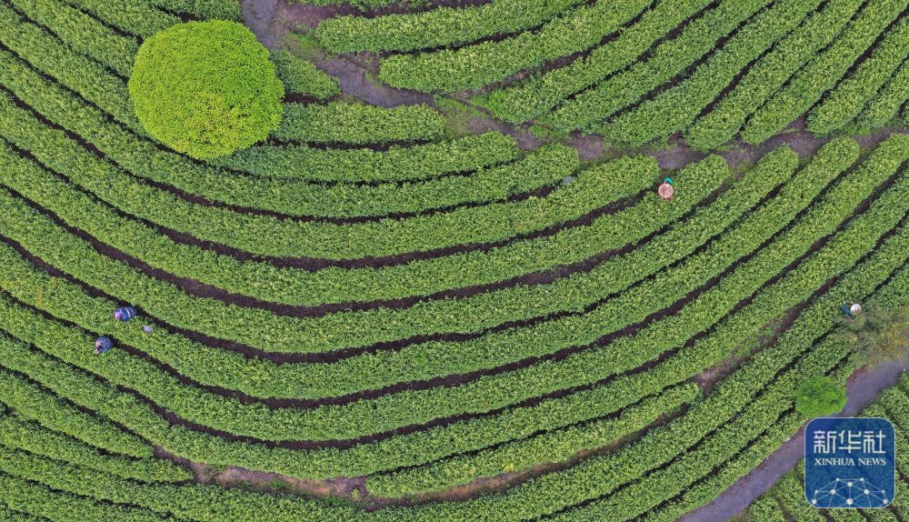 ↑ 4月17日,浙江省台州市仙居县横溪镇一生态茶园,茶农采摘“雨前茶”(无人机照片)。新华社发(王华斌摄)