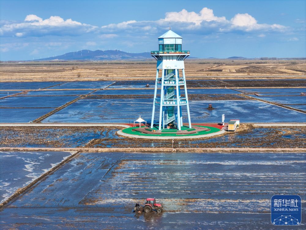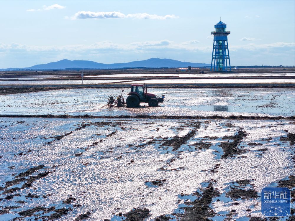 ↑ 4月18日,在黑龙江省富锦市万亩水稻公园,种植户驾驶农机进行打浆作业(无人机照片)。新华社发(曲玉宝摄)