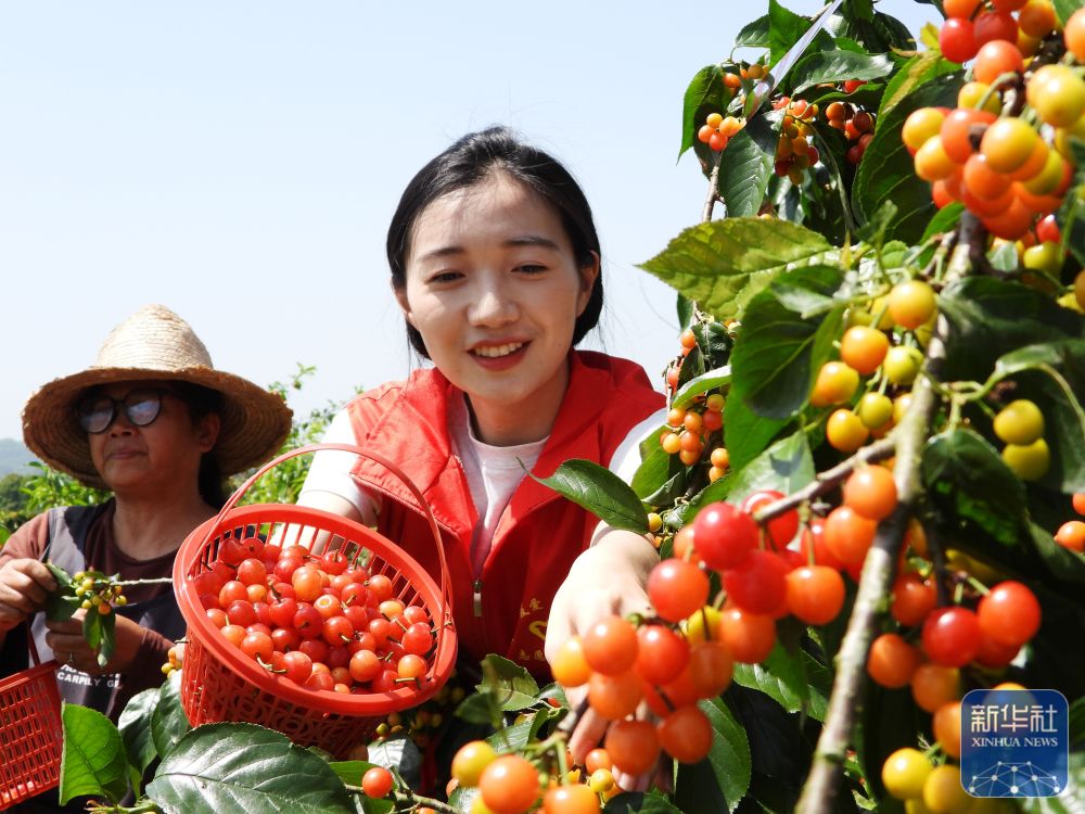 ↑ 4月18日,在四川省达州市渠县临巴镇云峰社区乡情生态园里,中国邮政集团有限公司四川省渠县分公司志愿者帮助果农采摘樱桃。新华社发(邓良奎摄)