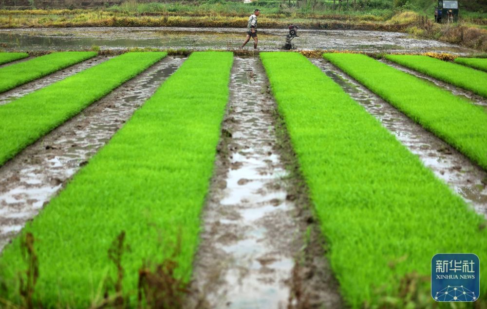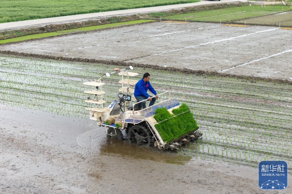 ↑ 4月17日,在湖南省资兴市唐洞街道镜塘村,农民驾驶插秧机抢插早稻秧苗。新华社发(李科摄)