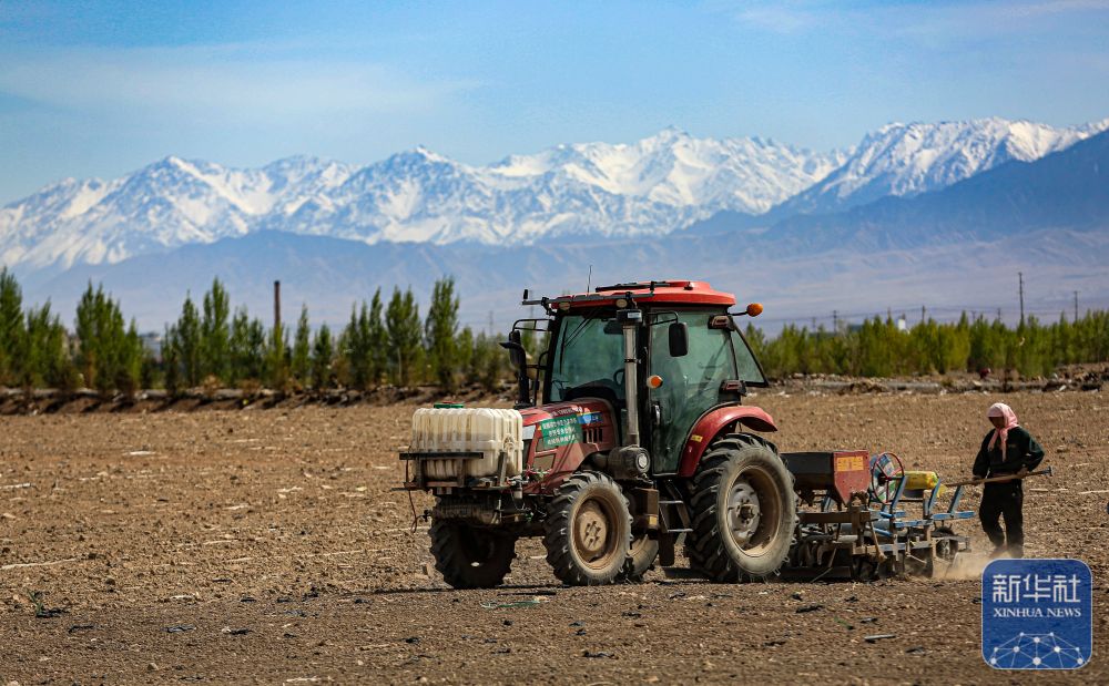 ↑ 4月17日,农民驾驶铺膜机在甘肃省张掖市甘州区甘浚镇速展村田间铺地膜。新华社发(陈礼摄)