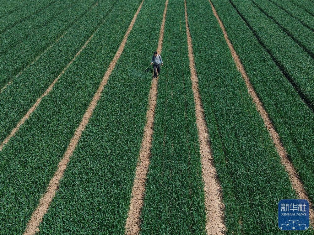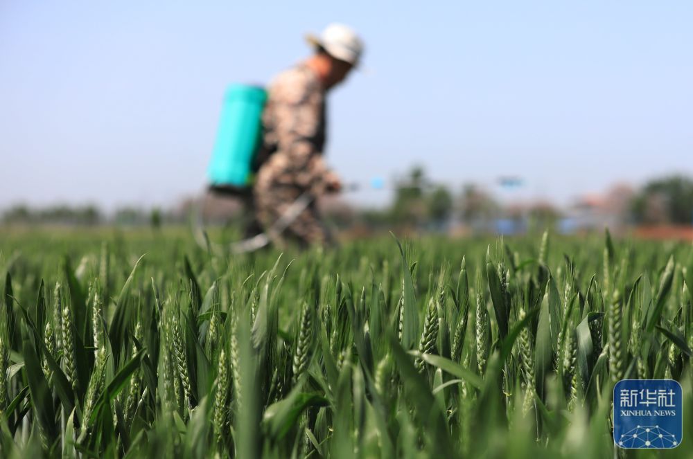 ↑ 4月17日,河南省焦作市温县岳村街道西坡村农民在麦田进行“一喷三防”作业。新华社发(黄福兴摄)