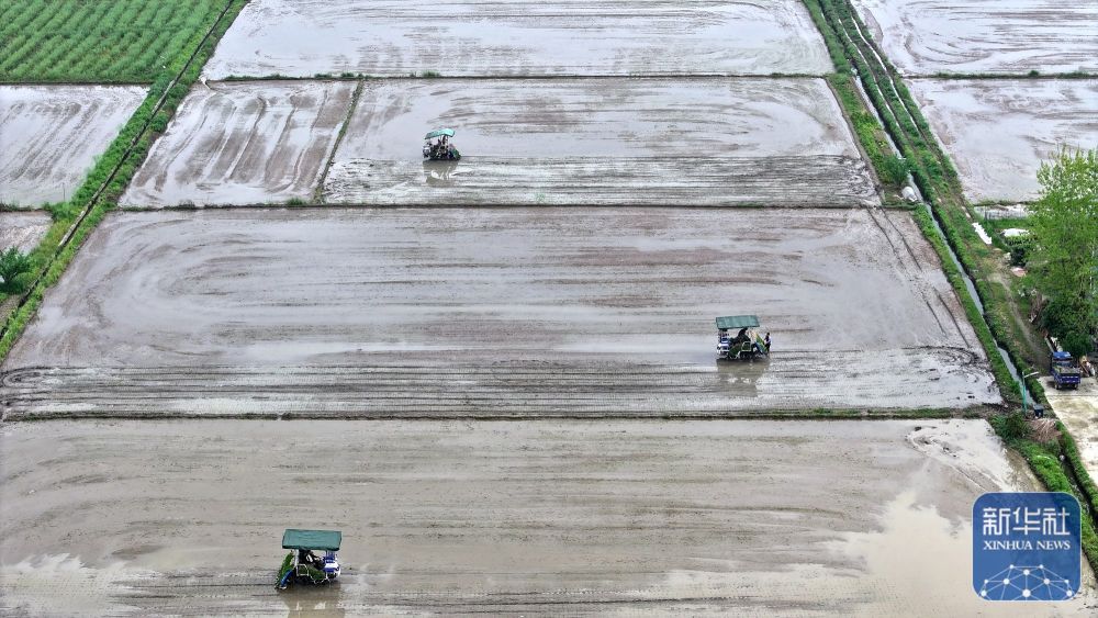 ↑ 4月17日,湖北省咸宁市通城县五里镇陈谷村,明海农业耕种专业合作社农机手驾驶插秧机进行早稻插秧作业(无人机照片)。新华社发(刘建平摄)