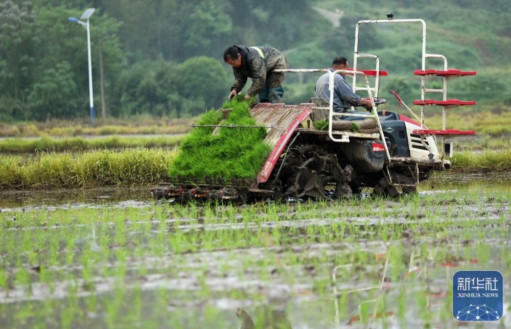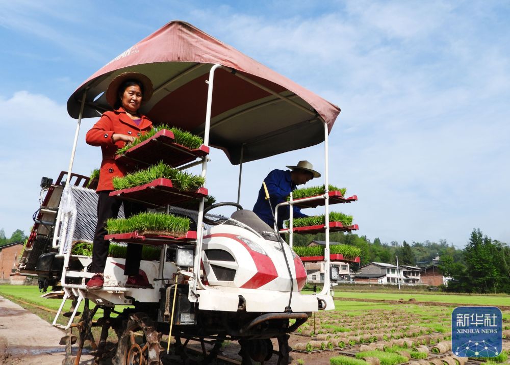 ↑ 4月16日,在四川达州东部经开区麻柳镇檀木社区的高标准农田里,农民给插秧机添加水稻秧苗。新华社发(邓良奎摄)