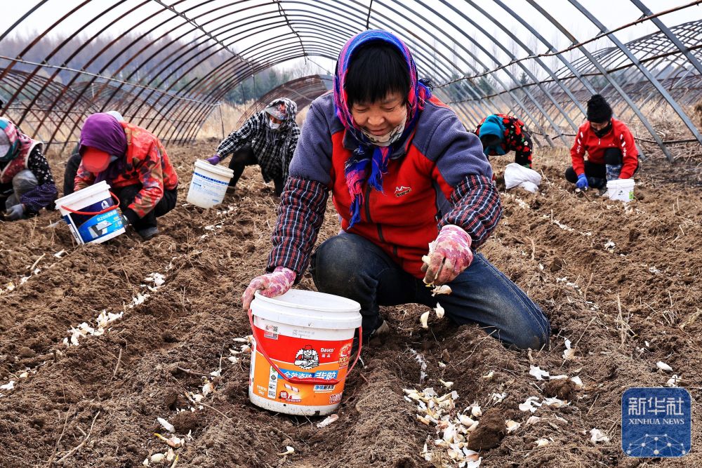 ↑ 4月17日,在黑龙江省同江市乐业镇,农户在栽种独头蒜。新华社发(刘万平摄)