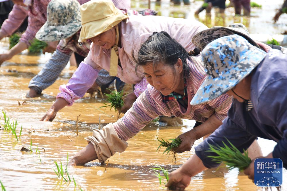 ↑ 4月18日,在云南省蒙自市草坝镇的袁隆平超级杂交水稻蒙自示范基地,农民进行水稻插秧工作。新华社发(薛莹莹摄)