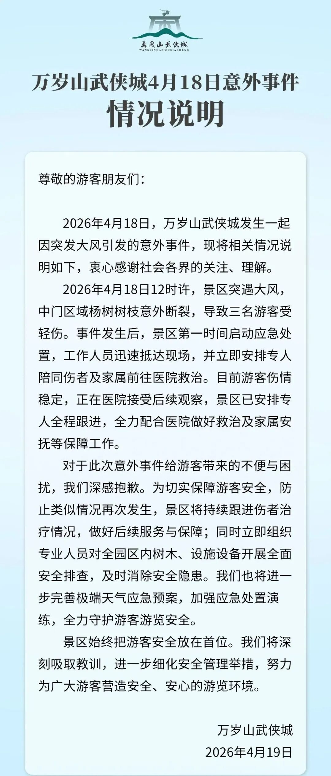 万岁山武侠城4月19日发布通报称,4月18日,万岁山武侠城发生一起因突发大风引发的意外事件,中门区域杨树树枝意外断裂,导致三名游客受轻伤。