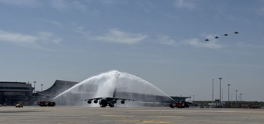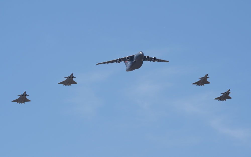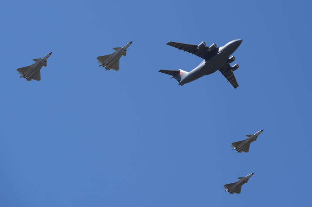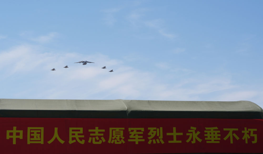 ↑4月22日,接迎第十三批在韩中国人民志愿军烈士遗骸回国的空军运-20B飞抵沈阳,4架歼-20战机护航。