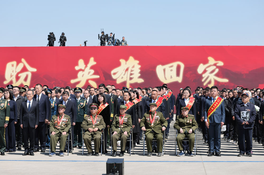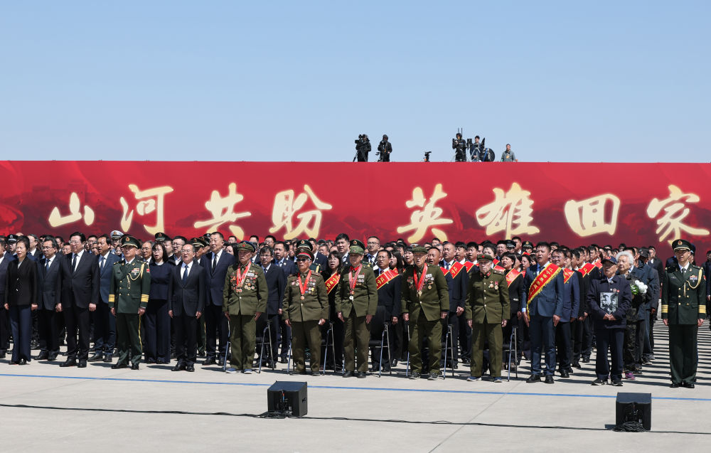 ↑4月22日,抗美援朝老战士等各界人士在沈阳桃仙国际机场迎接英雄回家。