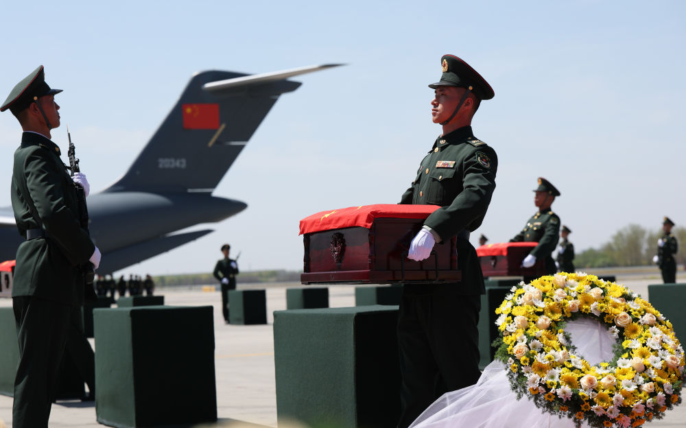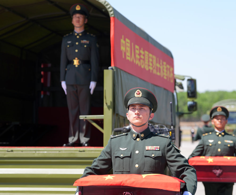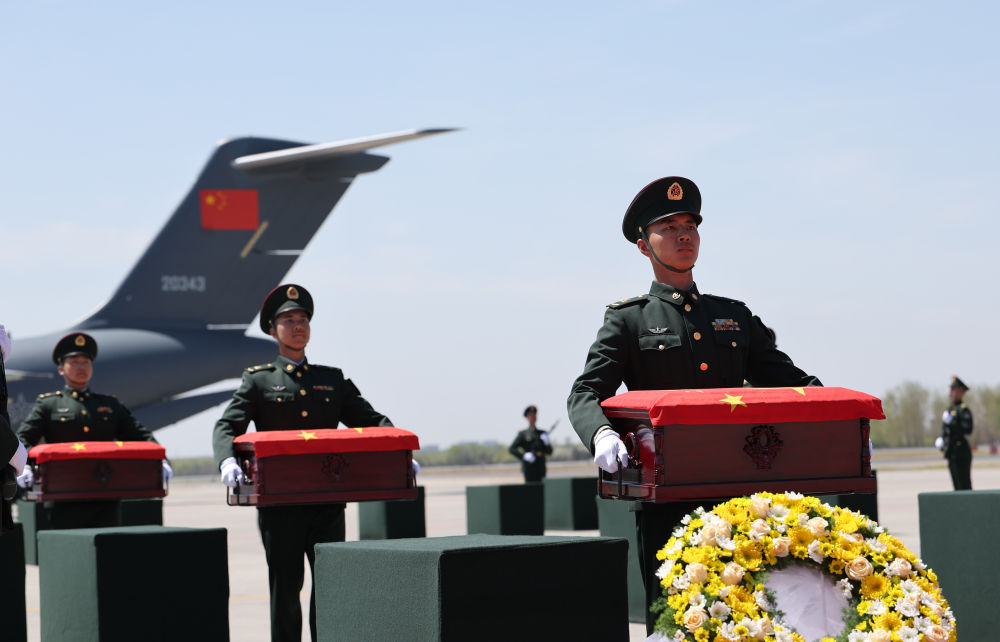 4月22日上午,第十三批在韩中国人民志愿军烈士遗骸由中国空军运-20B从韩国接回辽宁沈阳。12位志愿军烈士英灵及146件遗物回到祖国怀抱。