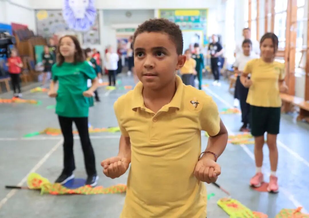 2023年10月2日,英国伦敦弗洛拉花园小学学生跟随来自中国的体育教师学习武术动作。新华社照片