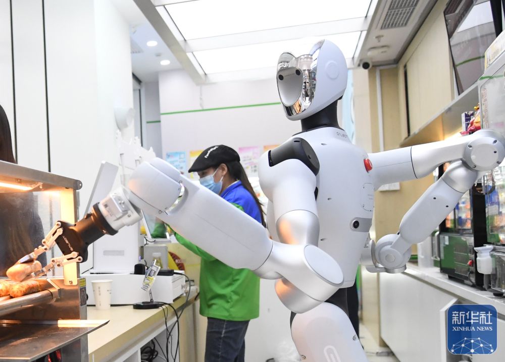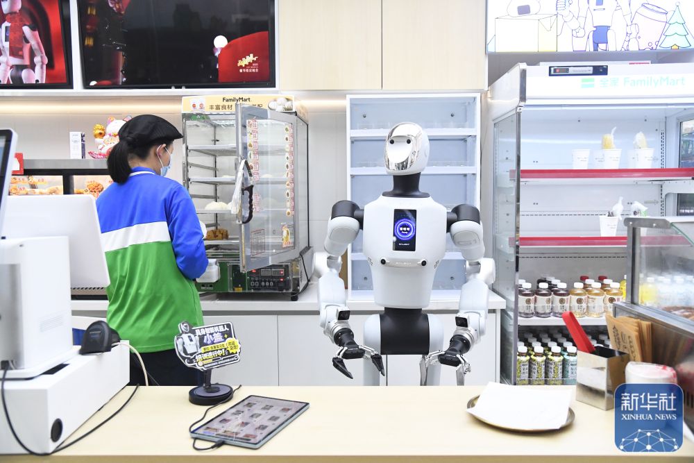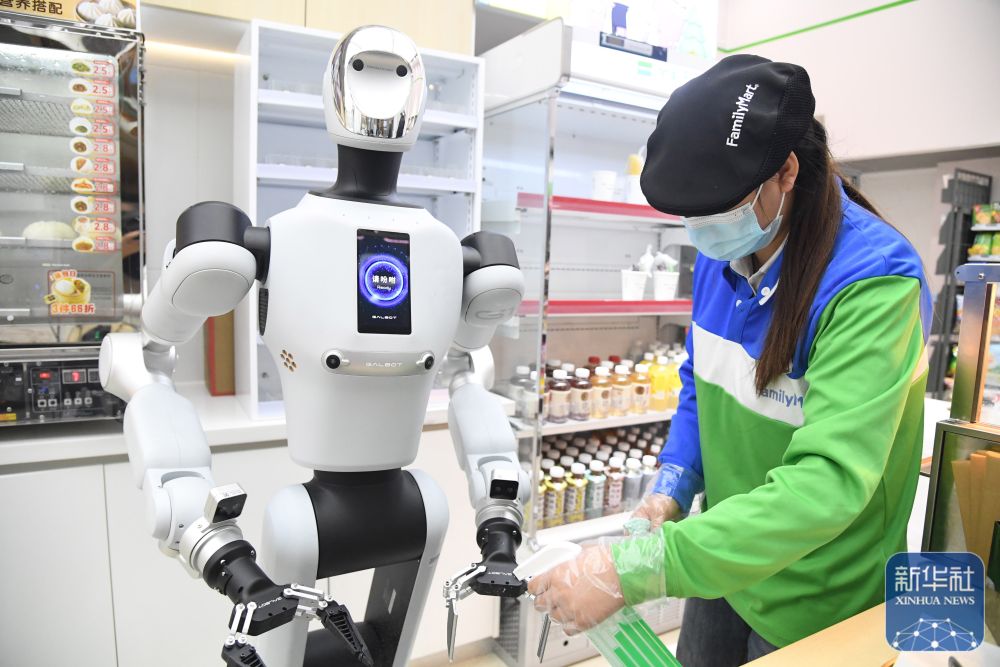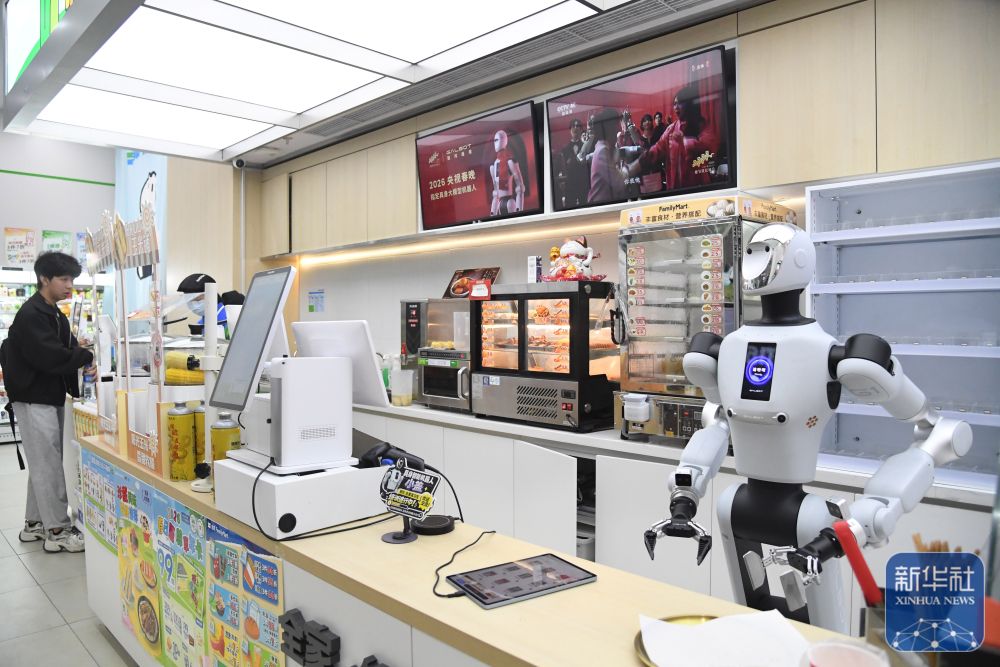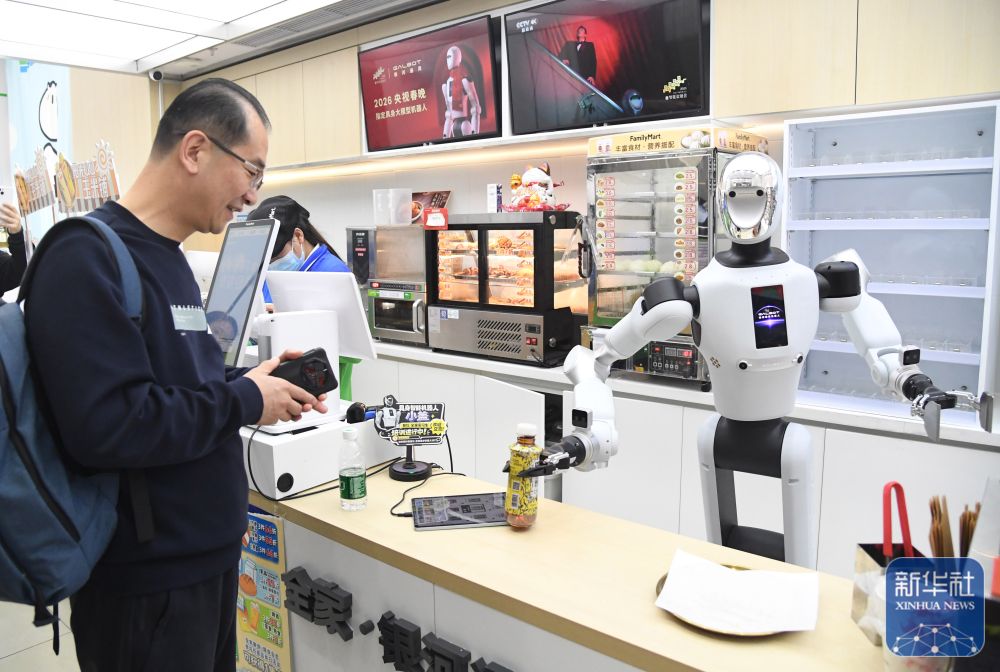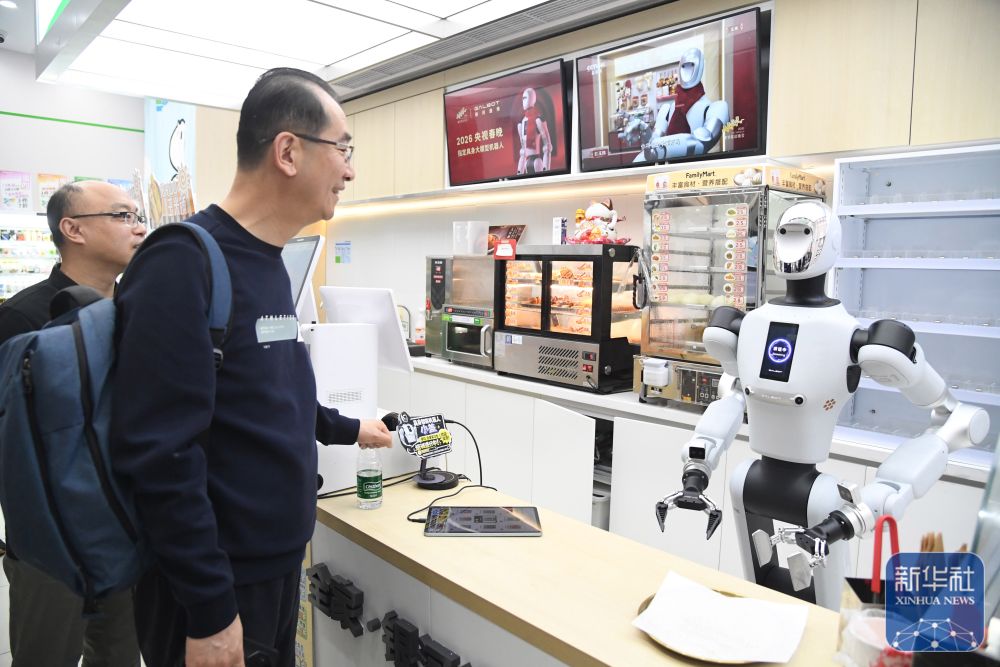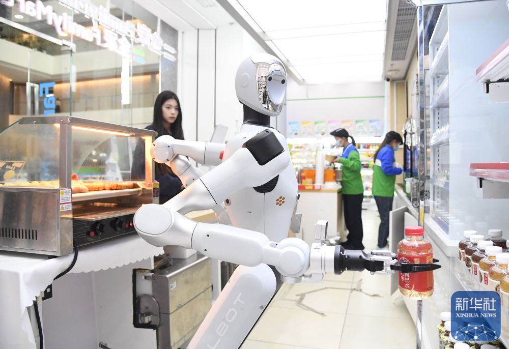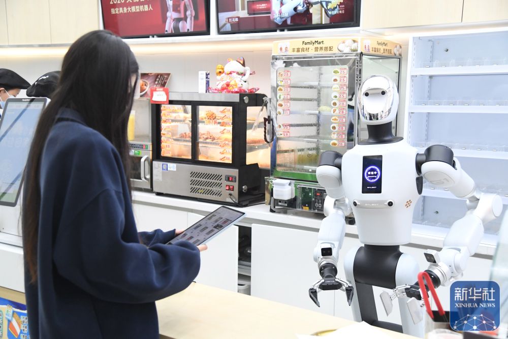 近日,一款具身大模型机器人进驻北京市海淀区中关村大街一座大厦内的便利店,开启常态化服务。据了解,该款机器人可以在便利店中完成迎宾互动、通过语音交互响应商品查询、促销咨询等揽客接待需求。与此同时,它还可以自主完成冷饮、熟食等商品的取放与递交,助力提升顾客购物体验。新华社记者 任超 摄影报道