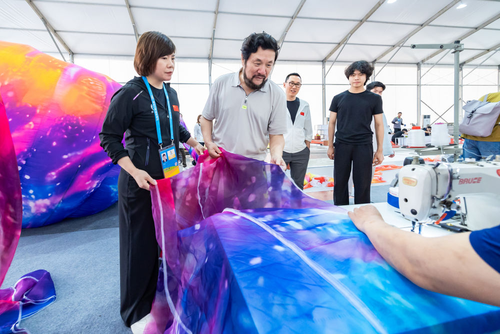 4月12日,演员在彩排中调试海洋生物模型。新华社发(朱启荣摄)