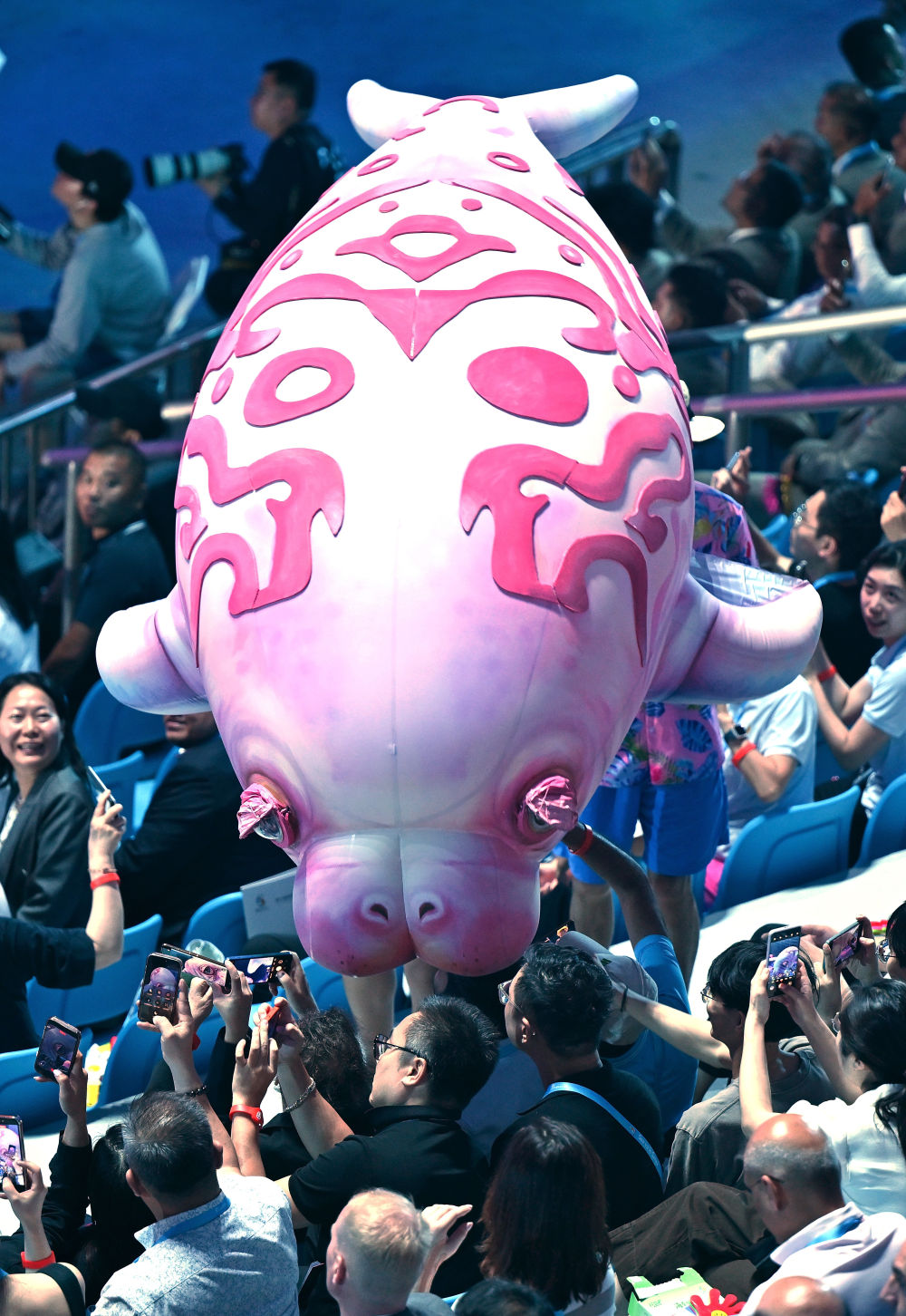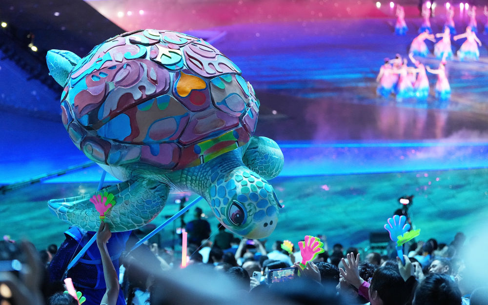 4月22日,演员操作海洋生物模型在第六届亚洲沙滩运动会开幕式上与观众互动。新华社发(马子涵摄)