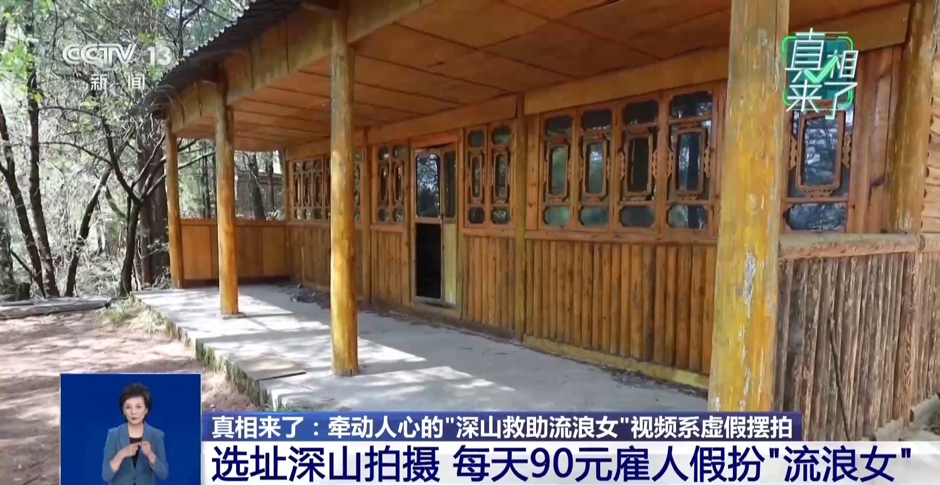画面里,“流浪女”头发杂乱、衣衫褴褛,蜷缩在木屋角落浑身发抖、眼神躲闪;拍摄者俯身关切询问伤情来历,承诺更换被褥、提供食物,言语间满是“善意”。