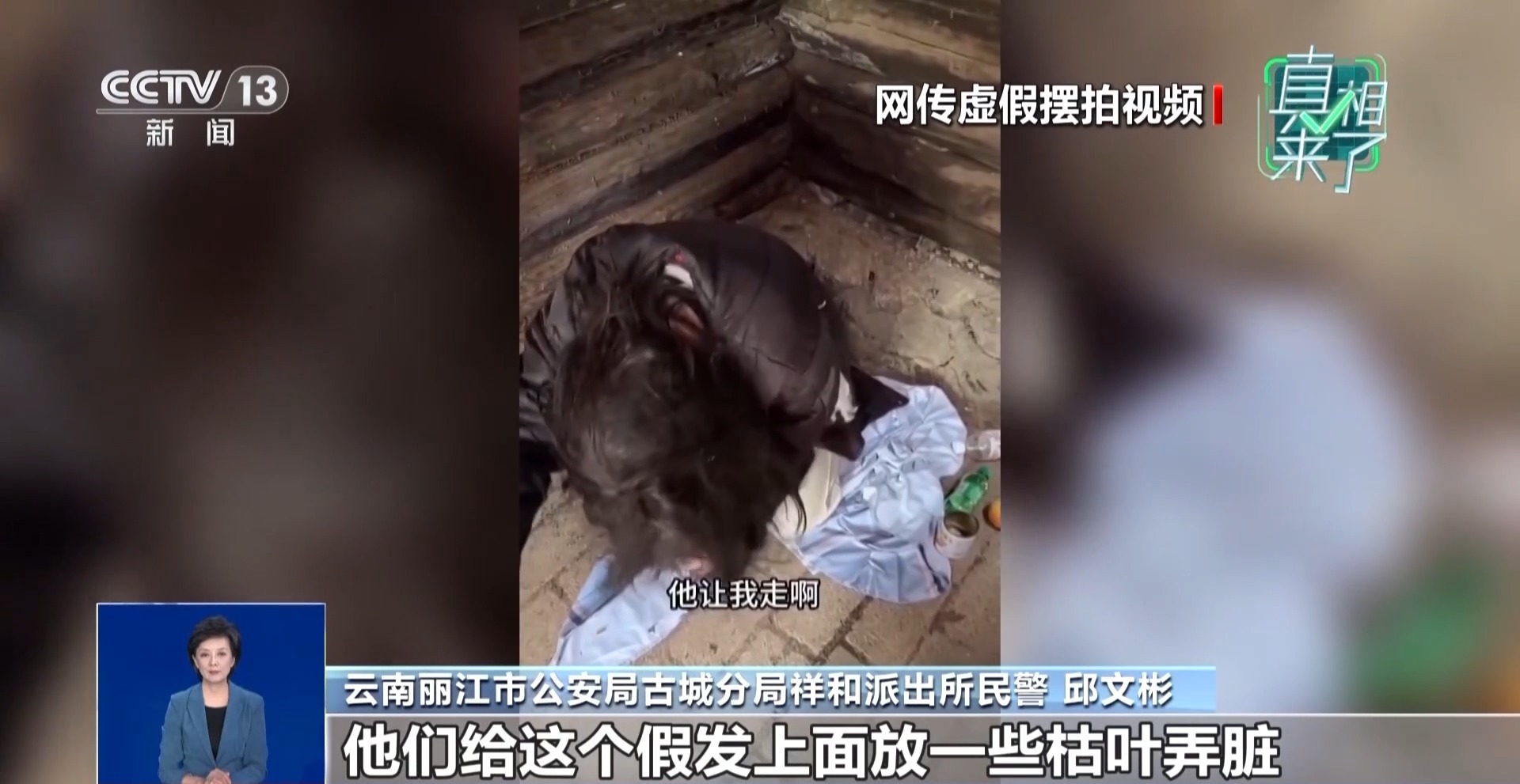 云南省丽江市公安局古城分局祥和派出所民警 邱文彬:演员杨某某去准备的时候,特意叮嘱她,不要自己化妆,不要往脸上擦粉。到了现场以后,他们给假发上面放一些枯叶弄脏,把假发弄得凌乱,再给她披上去,然后在她的手臂上弄一些受伤的痕迹,当然那个也是化妆化上去的。衣着方面也会强调,不要穿白鞋子、干净的鞋子,然后用床单裹住,穿着破棉袄,让她瑟瑟发抖,整个过程都是按照刘某他们设计好的剧本来演的。