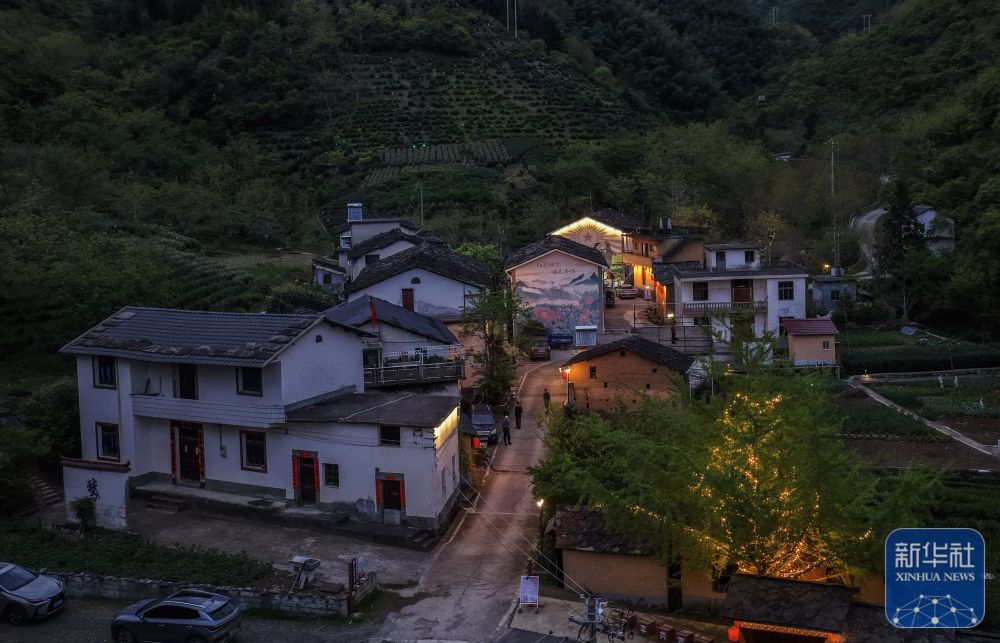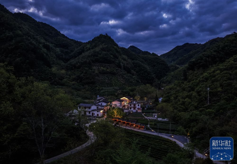 ↑ 夜色中的淳安县屏门乡金陵村(4月24日摄,无人机照片)。
