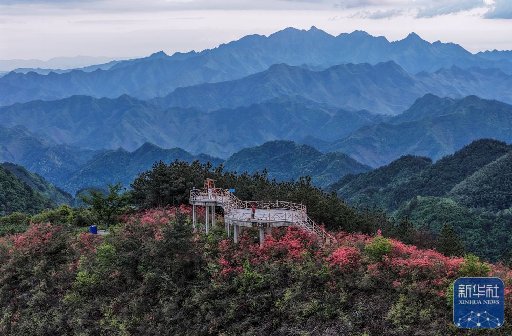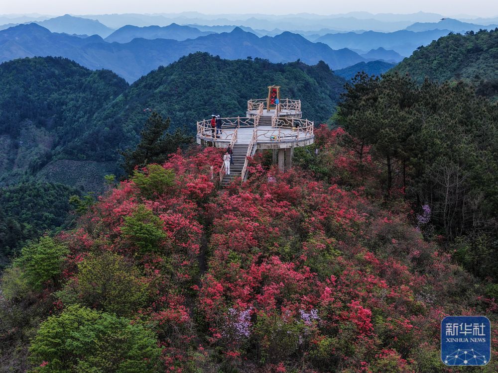 ↑ 4月24日,游客在金陵村杜鹃花海的观景平台上拍照留影(无人机照片)。
