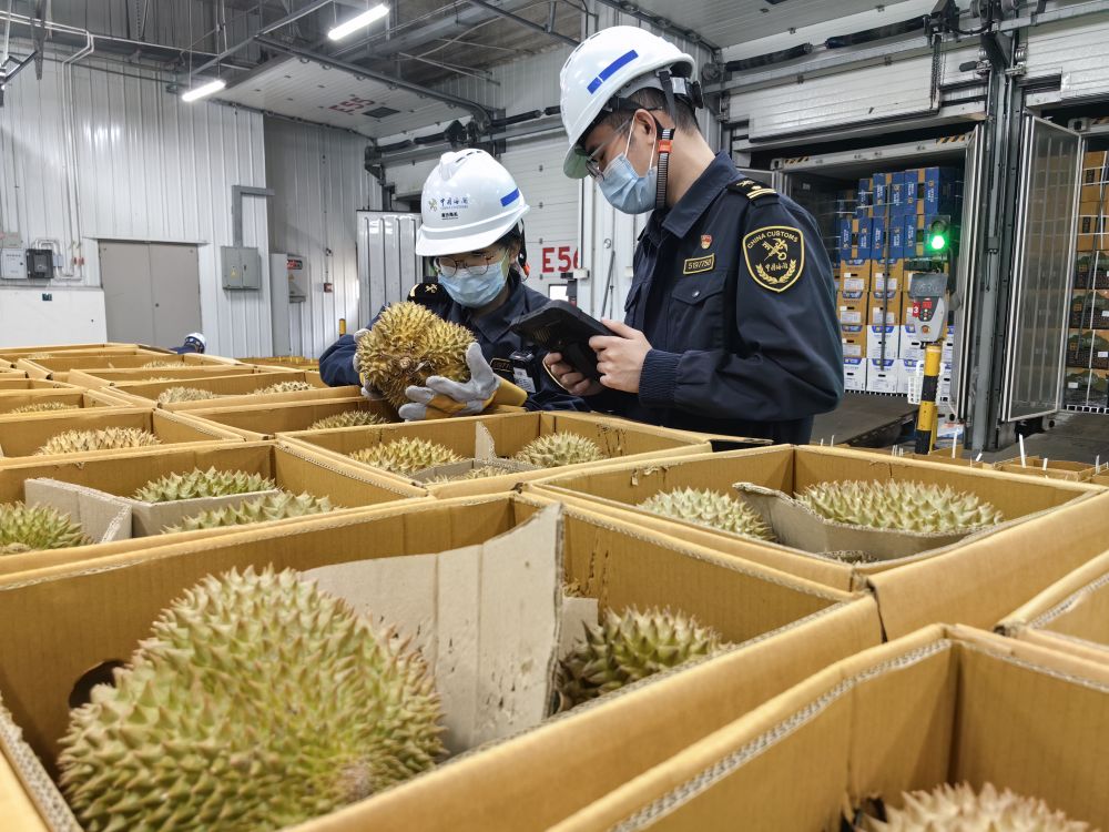 4月26日,南沙海关关员对进口鲜食榴莲进行监管查验。新华社发