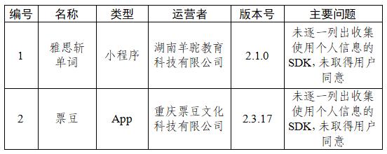 二、雅思斩单词、票豆等2款App未逐一列出收集使用个人信息的SDK,未取得用户同意(详见下表)。