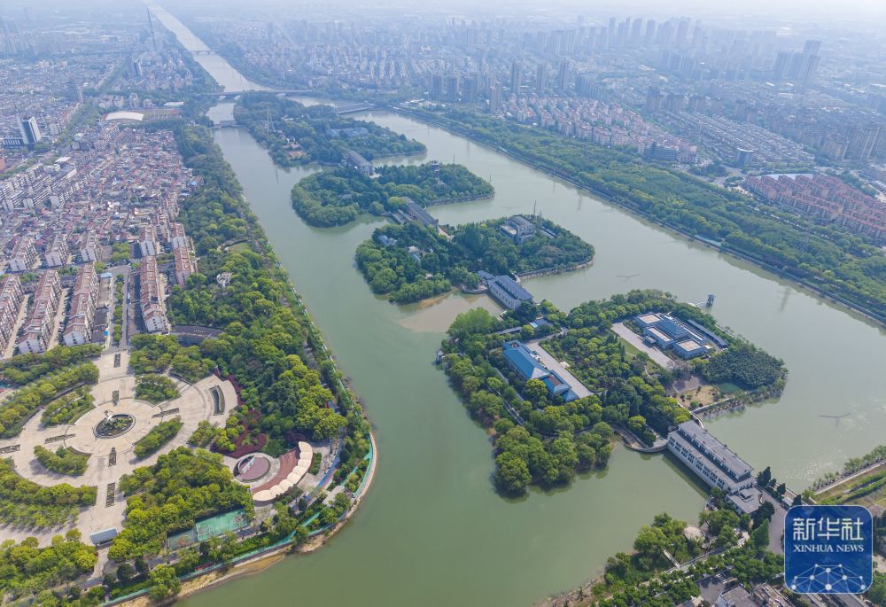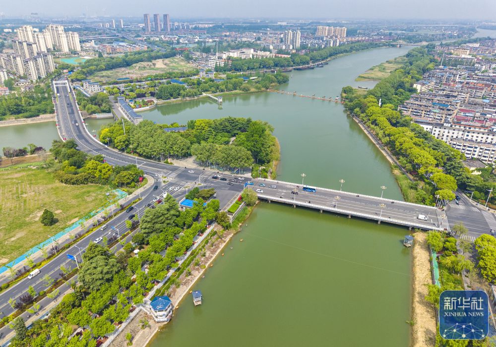 ↑ 4月27日拍摄的位于江苏省扬州市江都区的南水北调东线输水通道高水河(无人机照片)。