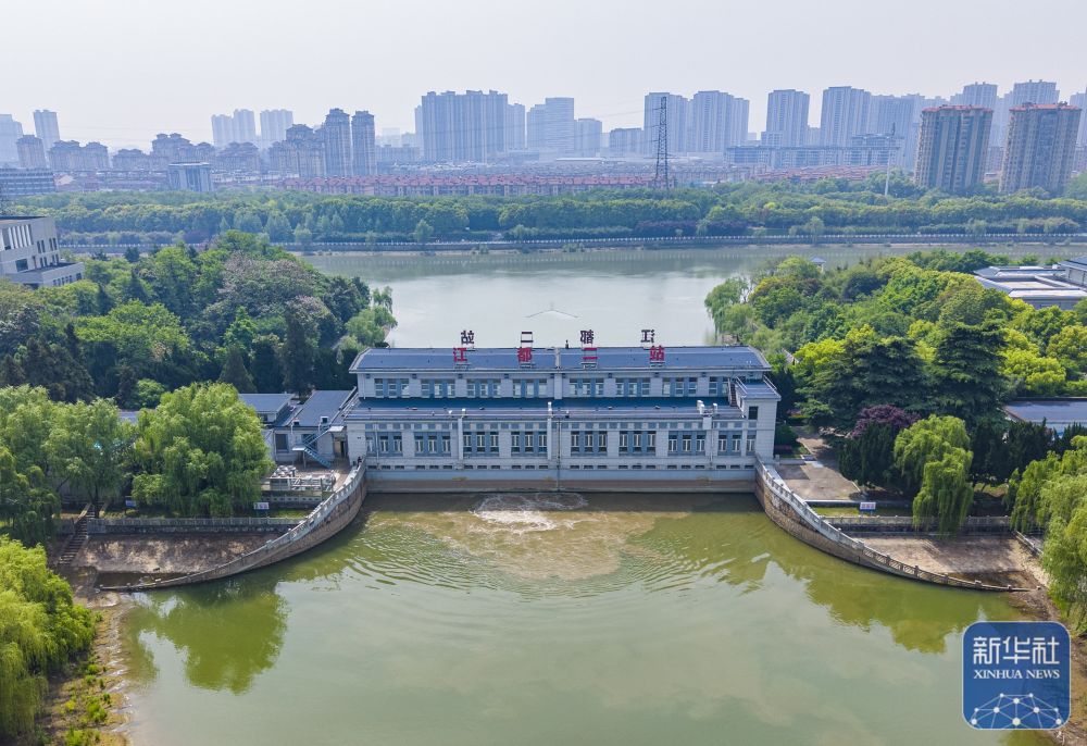 ↑ 4月27日,位于江苏省扬州市江都区的南水北调东线源头江都水利枢纽二站启动调水(无人机照片)。